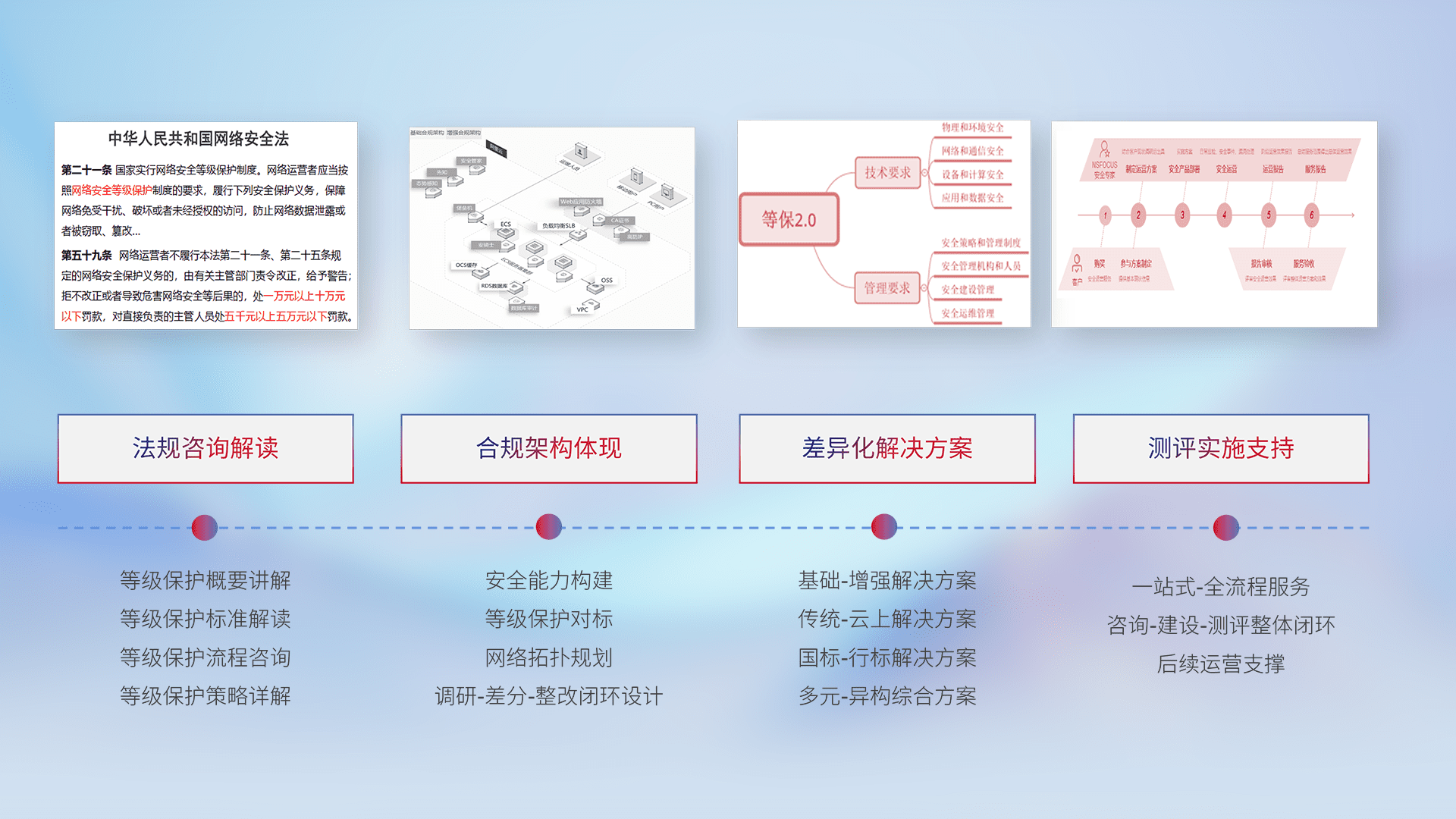 通过专业的法律咨询解读、、、合规架构体现、、差异化解决方案、、、测试实施支持等服务,,为客户量身打造等保合规体系。。。。